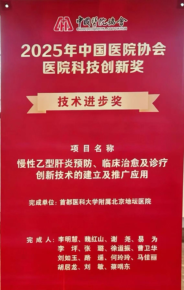 首都医科大学附属北京地坛医院肝病中心二科李明慧团队《慢性乙型肝炎预防、临床治愈及诊断创新技术的建立及推广应用》荣获中国医院协会医院科技创新奖技术进步奖,成为本届获奖成果中唯一聚焦慢性乙型肝炎预防、临床治愈诊断创新技术建立的标杆项目。这是李明慧团队继2021年北京市科学技术进步奖、2022年首都医科大学科学技术进步奖以及2023年第八届中国女医师协会五洲女子科技奖临床医学科研创新奖后,再获创新奖项。