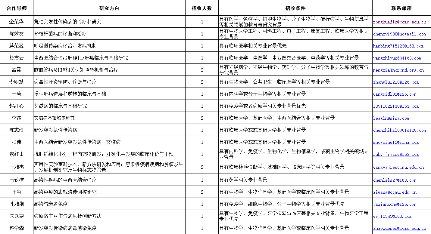 内科学(传染病)、内科学(消化系病)、神经病学、中西医结合临床医学、临床检验诊断学、免疫学、药学等相关专业。