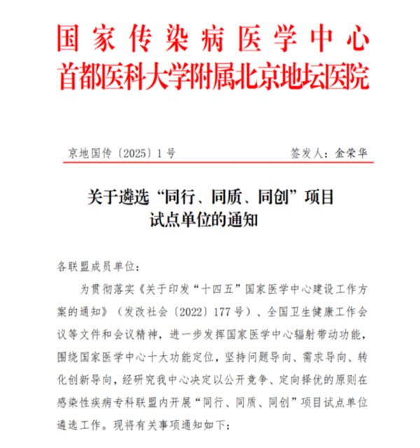 近日,国家传染病医学中心(北京)正式公布同行、同质、同创项目(以下简称三同项目)首批立项名单,18 家感染性疾病专科联盟成员单位凭借扎实的研究基础与创新方案脱颖而出,将在 HIV 快速启动抗病毒治疗规范化建设、医防融合数字影像技术研发两大领域开展研究,为传染病防治体系高质量发展注入新动能。